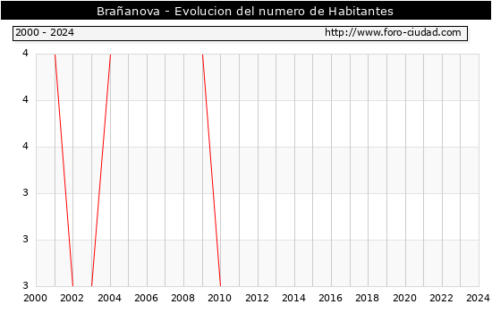el numero de habitantes en Brañanova era de 3, igual numero de habitantes que el en el año 2023. En el grafico siguiente se puede ver cuantos habitantes tiene Brañanova a lo largo de los años.