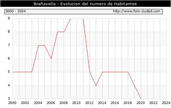 el numero de habitantes en Brañavella era de 3, igual numero de habitantes que el en el año 2023. En el grafico siguiente se puede ver cuantos habitantes tiene Brañavella a lo largo de los años.