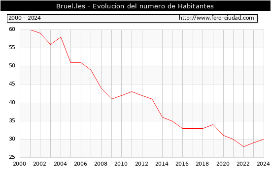 el numero de habitantes en Bruel.les era de 30, 1 habitantes mas que el en el año 2023. En el grafico siguiente se puede ver cuantos habitantes tiene Bruel.les a lo largo de los años.