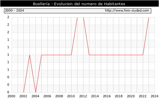 el numero de habitantes en Busllería era de 2, igual numero de habitantes que el en el año 2023. En el grafico siguiente se puede ver cuantos habitantes tiene Busllería a lo largo de los años.