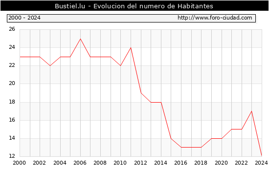el numero de habitantes en Bustiel.lu era de 12, 5 habitantes menos que el en el año 2023. En el grafico siguiente se puede ver cuantos habitantes tiene Bustiel.lu a lo largo de los años.