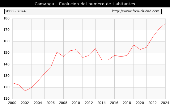 el numero de habitantes en Camangu era de 176, 5 habitantes mas que el en el año 2023. En el grafico siguiente se puede ver cuantos habitantes tiene Camangu a lo largo de los años.
