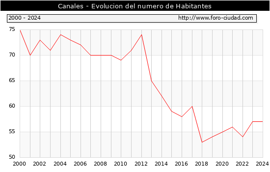 Segun los datos publicados por el INE a 1 de Enero de 2024 el numero de habitantes en Canales era de 57, igual numero de habitantes que el en el año 2023. En el grafico siguiente se puede ver cuantos habitantes tiene Canales a lo largo de los años.