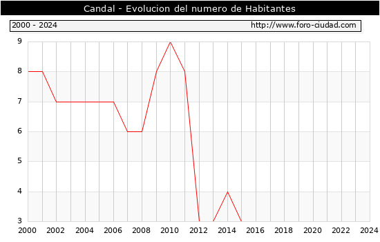 el numero de habitantes en Candal era de 3, igual numero de habitantes que el en el año 2023. En el grafico siguiente se puede ver cuantos habitantes tiene Candal a lo largo de los años.