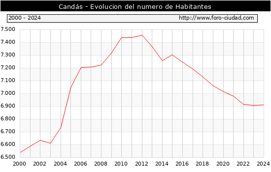 el numero de habitantes en Candás era de 6.910, 2 habitantes mas que el en el año 2023. En el grafico siguiente se puede ver cuantos habitantes tiene Candás a lo largo de los años.