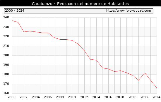 el numero de habitantes en Carabanzo era de 166, 8 habitantes menos que el en el año 2023. En el grafico siguiente se puede ver cuantos habitantes tiene Carabanzo a lo largo de los años.