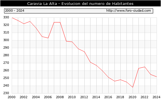 el numero de habitantes en Caravia La Alta era de 252, 3 habitantes menos que el en el año 2023. En el grafico siguiente se puede ver cuantos habitantes tiene Caravia La Alta a lo largo de los años.