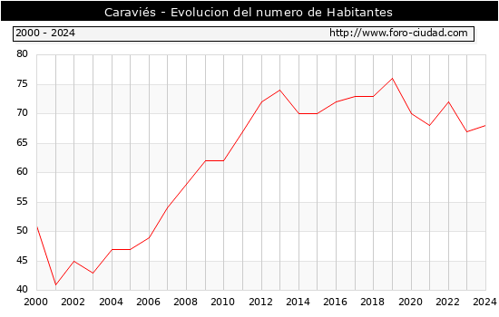 el numero de habitantes en Caraviés era de 68, 1 habitantes mas que el en el año 2023. En el grafico siguiente se puede ver cuantos habitantes tiene Caraviés a lo largo de los años.