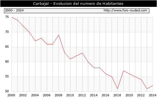 el numero de habitantes en Carbajal era de 52, 1 habitantes mas que el en el año 2023. En el grafico siguiente se puede ver cuantos habitantes tiene Carbajal a lo largo de los años.
