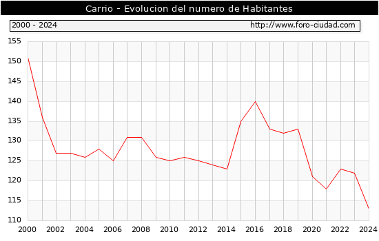 el numero de habitantes en Carrio era de 113, 9 habitantes menos que el en el año 2023. En el grafico siguiente se puede ver cuantos habitantes tiene Carrio a lo largo de los años.