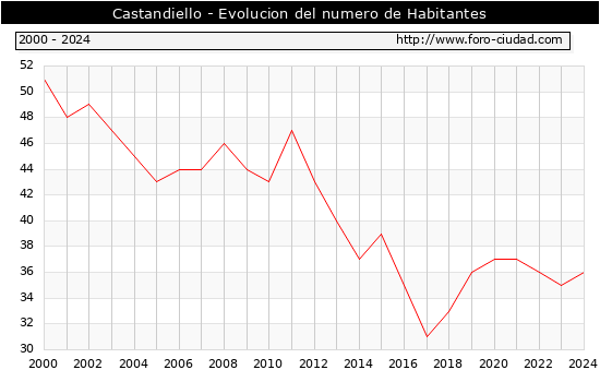el numero de habitantes en Castandiello era de 36, 1 habitantes mas que el en el año 2023. En el grafico siguiente se puede ver cuantos habitantes tiene Castandiello a lo largo de los años.