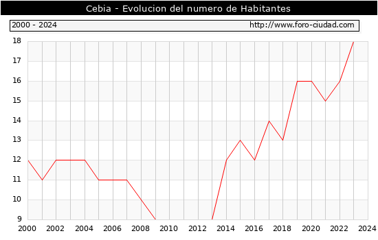 el numero de habitantes en Cebia era de 18, igual numero de habitantes que el en el año 2023. En el grafico siguiente se puede ver cuantos habitantes tiene Cebia a lo largo de los años.