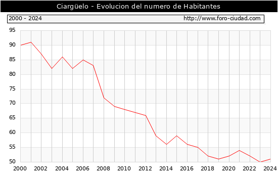 el numero de habitantes en Ciargüelo era de 51, 1 habitantes mas que el en el año 2023. En el grafico siguiente se puede ver cuantos habitantes tiene Ciargüelo a lo largo de los años.