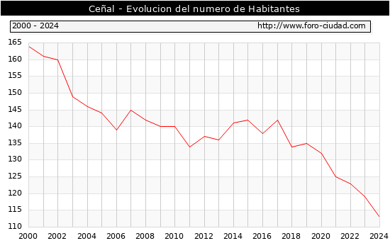 Segun los datos publicados por el INE a 1 de Enero de 2024 el numero de habitantes en Ceñal era de 113, 6 habitantes menos que el en el año 2023. En el grafico siguiente se puede ver cuantos habitantes tiene Ceñal a lo largo de los años.