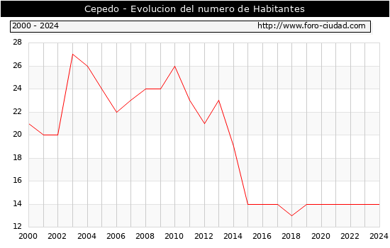 el numero de habitantes en Cepedo era de 14, igual numero de habitantes que el en el año 2023. En el grafico siguiente se puede ver cuantos habitantes tiene Cepedo a lo largo de los años.