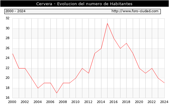 el numero de habitantes en Cervera era de 19, 1 habitantes menos que el en el año 2023. En el grafico siguiente se puede ver cuantos habitantes tiene Cervera a lo largo de los años.