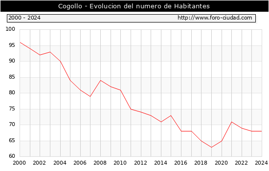el numero de habitantes en Cogollo era de 68, igual numero de habitantes que el en el año 2023. En el grafico siguiente se puede ver cuantos habitantes tiene Cogollo a lo largo de los años.