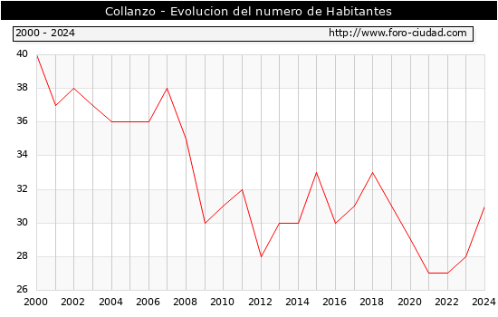 el numero de habitantes en Collanzo era de 31, 3 habitantes mas que el en el año 2023. En el grafico siguiente se puede ver cuantos habitantes tiene Collanzo a lo largo de los años.