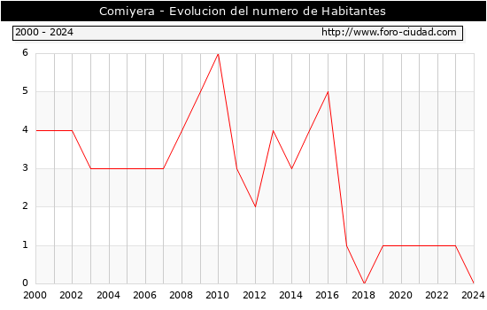 el numero de habitantes en Comiyera era de 0, 1 habitantes menos que el en el año 2023. En el grafico siguiente se puede ver cuantos habitantes tiene Comiyera a lo largo de los años.