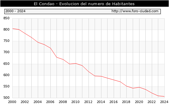 el numero de habitantes en El Condao era de 507, 3 habitantes menos que el en el año 2023. En el grafico siguiente se puede ver cuantos habitantes tiene El Condao a lo largo de los años.
