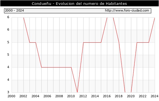 el numero de habitantes en Condueñu era de 6, 1 habitantes mas que el en el año 2023. En el grafico siguiente se puede ver cuantos habitantes tiene Condueñu a lo largo de los años.