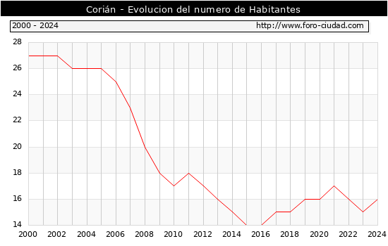 el numero de habitantes en Corián era de 16, 1 habitantes mas que el en el año 2023. En el grafico siguiente se puede ver cuantos habitantes tiene Corián a lo largo de los años.