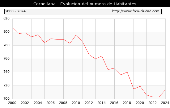 el numero de habitantes en Cornellana era de 714, 11 habitantes mas que el en el año 2023. En el grafico siguiente se puede ver cuantos habitantes tiene Cornellana a lo largo de los años.
