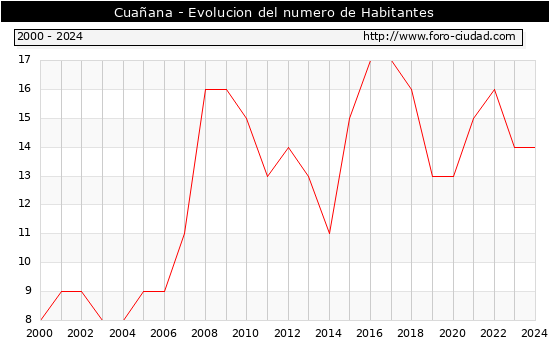el numero de habitantes en Cuañana era de 14, igual numero de habitantes que el en el año 2023. En el grafico siguiente se puede ver cuantos habitantes tiene Cuañana a lo largo de los años.
