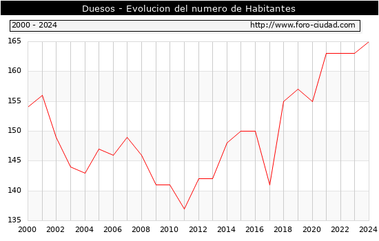 el numero de habitantes en Duesos era de 165, 2 habitantes mas que el en el año 2023. En el grafico siguiente se puede ver cuantos habitantes tiene Duesos a lo largo de los años.