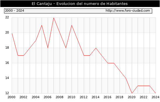 el numero de habitantes en El Cantaju era de 12, 1 habitantes menos que el en el año 2023. En el grafico siguiente se puede ver cuantos habitantes tiene El Cantaju a lo largo de los años.