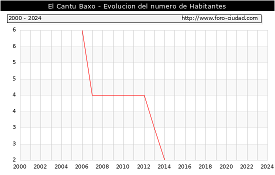 el numero de habitantes en El Cantu Baxo era de 2, igual numero de habitantes que el en el año 2023. En el grafico siguiente se puede ver cuantos habitantes tiene El Cantu Baxo a lo largo de los años.