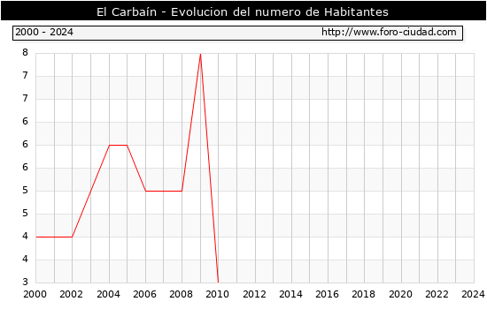 el numero de habitantes en El Carbaín era de 3, igual numero de habitantes que el en el año 2023. En el grafico siguiente se puede ver cuantos habitantes tiene El Carbaín a lo largo de los años.