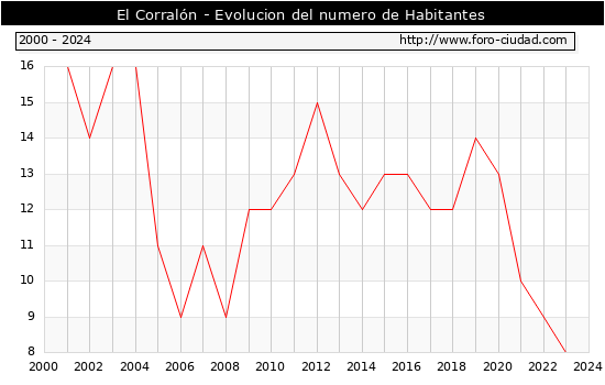 el numero de habitantes en El Corralón era de 8, igual numero de habitantes que el en el año 2023. En el grafico siguiente se puede ver cuantos habitantes tiene El Corralón a lo largo de los años.