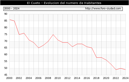 el numero de habitantes en El Cueto era de 49, 1 habitantes menos que el en el año 2023. En el grafico siguiente se puede ver cuantos habitantes tiene El Cueto a lo largo de los años.