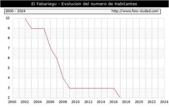 el numero de habitantes en El Fabariegu era de 2, igual numero de habitantes que el en el año 2023. En el grafico siguiente se puede ver cuantos habitantes tiene El Fabariegu a lo largo de los años.