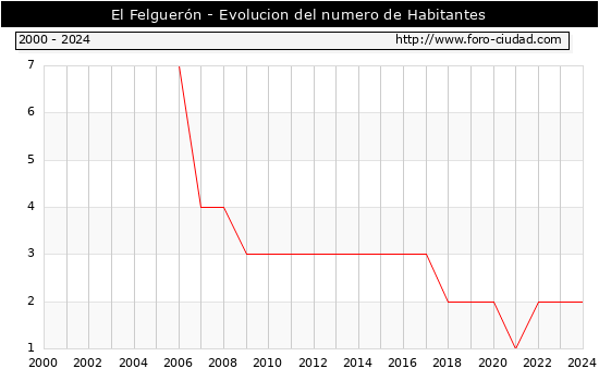 el numero de habitantes en El Felguerón era de 2, igual numero de habitantes que el en el año 2023. En el grafico siguiente se puede ver cuantos habitantes tiene El Felguerón a lo largo de los años.