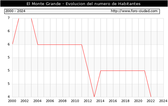 el numero de habitantes en El Monte Grande era de 4, igual numero de habitantes que el en el año 2023. En el grafico siguiente se puede ver cuantos habitantes tiene El Monte Grande a lo largo de los años.