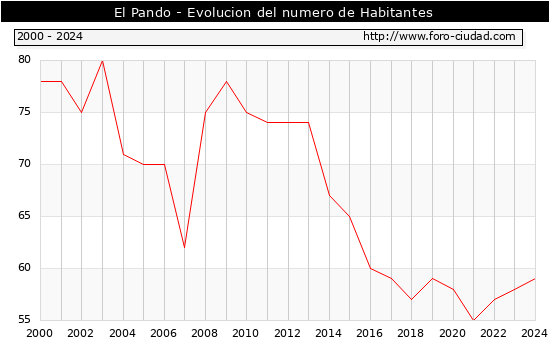 el numero de habitantes en El Pando era de 59, 1 habitantes mas que el en el año 2023. En el grafico siguiente se puede ver cuantos habitantes tiene El Pando a lo largo de los años.