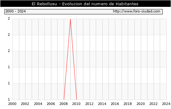 Segun los datos publicados por el INE a 1 de Enero de 2024 el numero de habitantes en El Rebollusu era de 1, igual numero de habitantes que el en el año 2023. En el grafico siguiente se puede ver cuantos habitantes tiene El Rebollusu a lo largo de los años.