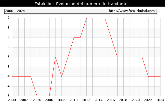 el numero de habitantes en Estalello era de 4, igual numero de habitantes que el en el año 2023. En el grafico siguiente se puede ver cuantos habitantes tiene Estalello a lo largo de los años.