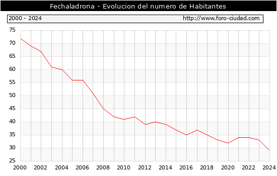 el numero de habitantes en Fechaladrona era de 29, 4 habitantes menos que el en el año 2023. En el grafico siguiente se puede ver cuantos habitantes tiene Fechaladrona a lo largo de los años.