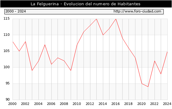 el numero de habitantes en La Felguerina era de 105, 7 habitantes mas que el en el año 2023. En el grafico siguiente se puede ver cuantos habitantes tiene La Felguerina a lo largo de los años.