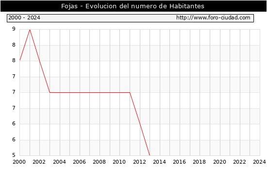 el numero de habitantes en Fojas era de 5, igual numero de habitantes que el en el año 2023. En el grafico siguiente se puede ver cuantos habitantes tiene Fojas a lo largo de los años.