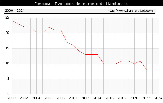 el numero de habitantes en Fonceca era de 8, igual numero de habitantes que el en el año 2023. En el grafico siguiente se puede ver cuantos habitantes tiene Fonceca a lo largo de los años.
