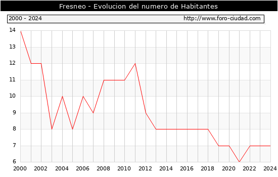 el numero de habitantes en Fresneo era de 7, igual numero de habitantes que el en el año 2023. En el grafico siguiente se puede ver cuantos habitantes tiene Fresneo a lo largo de los años.