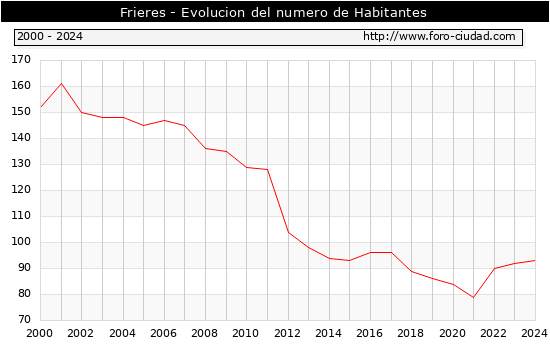el numero de habitantes en Frieres era de 93, 1 habitantes mas que el en el año 2023. En el grafico siguiente se puede ver cuantos habitantes tiene Frieres a lo largo de los años.