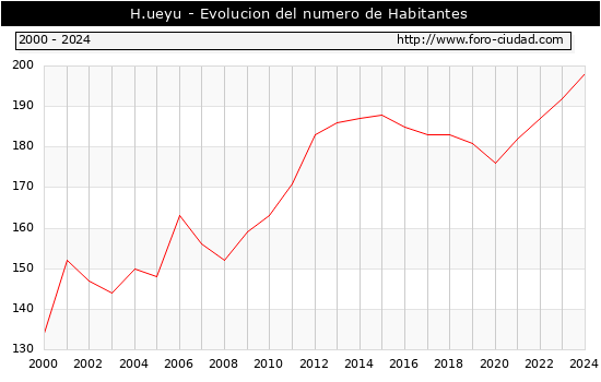 el numero de habitantes en H.ueyu era de 198, 6 habitantes mas que el en el año 2023. En el grafico siguiente se puede ver cuantos habitantes tiene H.ueyu a lo largo de los años.
