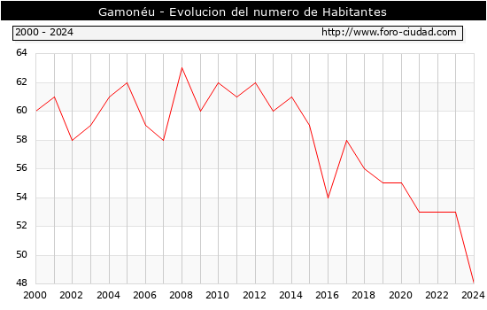el numero de habitantes en Gamonéu era de 48, 5 habitantes menos que el en el año 2023. En el grafico siguiente se puede ver cuantos habitantes tiene Gamonéu a lo largo de los años.