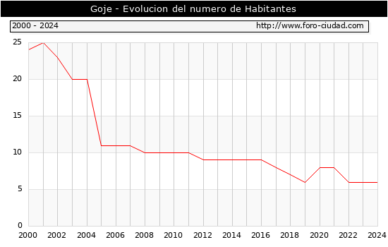 el numero de habitantes en Goje era de 6, igual numero de habitantes que el en el año 2023. En el grafico siguiente se puede ver cuantos habitantes tiene Goje a lo largo de los años.