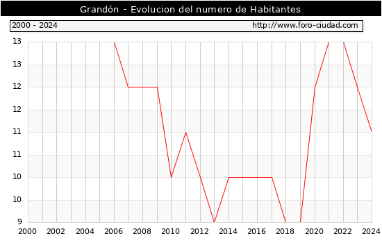 el numero de habitantes en Grandón era de 11, 1 habitantes menos que el en el año 2023. En el grafico siguiente se puede ver cuantos habitantes tiene Grandón a lo largo de los años.
